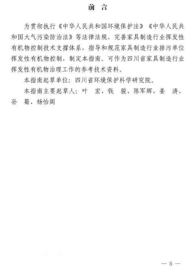为贯彻执行《中华人民共和国环境保护法》《中华人民共和国大气污染防治法》,加快推进挥发性有机物(VOCs)污染治理,改善环境空气质量,环境保护厅组织制定了四川省家具制造等5个重点行业挥发性有机物控制技术指南,经第13次厅务会议审议通过,现予以发布。