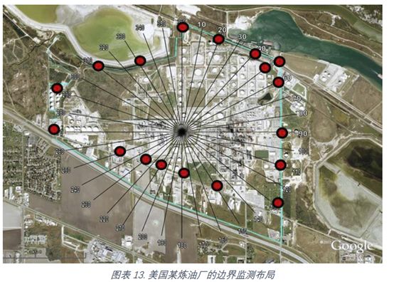 边界监测设备的布局要求记载在美国联邦环保署EPA方法325A中。该方法规定,监测仪应根据炼油厂的实际规模,沿着其四周边界以15-30度夹角分布设置。小型炼油厂的监测仪间距相对较大,而大型炼油厂的监测仪间距则相对较小。