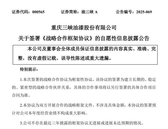 12月24日晚间,重庆涂料行业龙头企业渝三峡A(000565)发布重磅公告,宣布与广州工控建设发展有限公司签署《战略合作框架协议》,双方将在辐射制冷、石墨烯涂料等前沿新材料领域展开深度合作,共同推进新技术商业化与规模化落地。