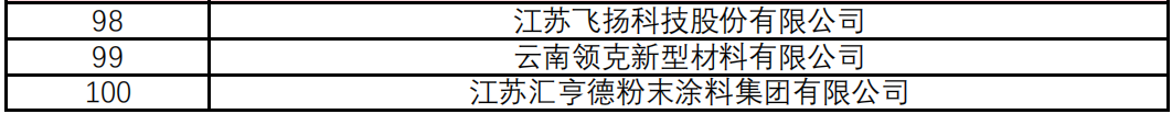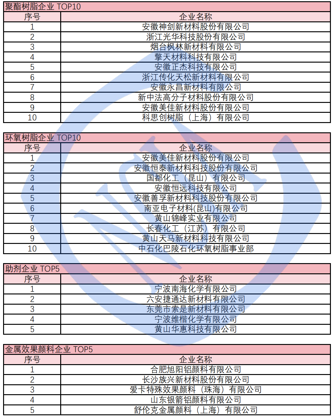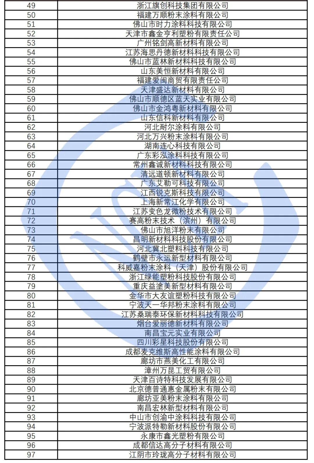 涂料记者注意到,此次不仅发布了中国粉末涂料TOP100,还同步发布了聚酯树脂TOP10、环氧树脂TOP10、助剂TOP5、金属效果颜料TOP5、涂装设备TOP5、粉末制造设备TOP10、进口喷枪TOP5、国内喷枪TOP3、TGIC固化剂TOP3、HAATOP3、有机颜料TOP5、化学前处理TOP3、填料TOP5、钛白粉TOP5等多个粉末涂料产业链榜单。