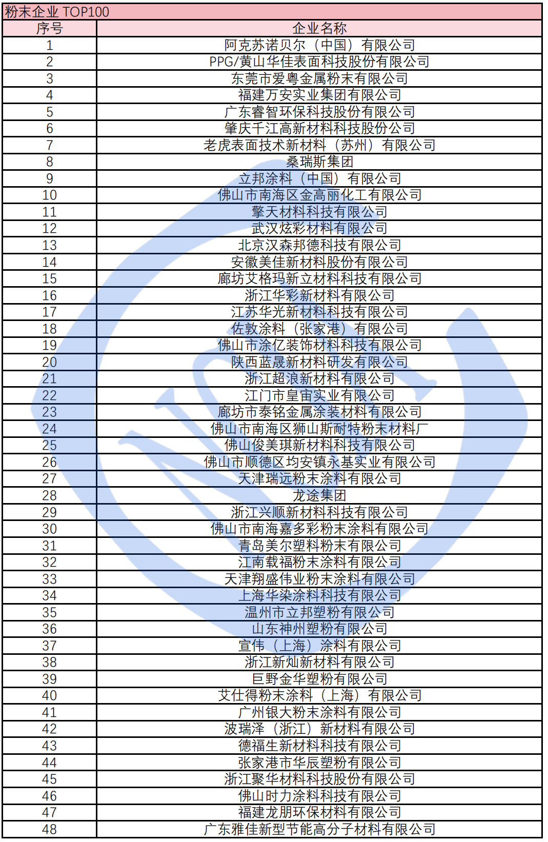 4月18日,中国涂料工业协会粉末涂料涂装分会发布了中国粉末涂料企业100强排行榜。据悉,本次排名按照国际惯例采用未税营业额为基准,是中国粉末涂料涂装行业最具公信力和权威性的统计结果,并参考了多项综合指标。榜单发布旨在为充分调研我国粉末涂料涂装市场格局,让行业各企业了解自身定位,促进企业竞争力,推动行业经济发展。